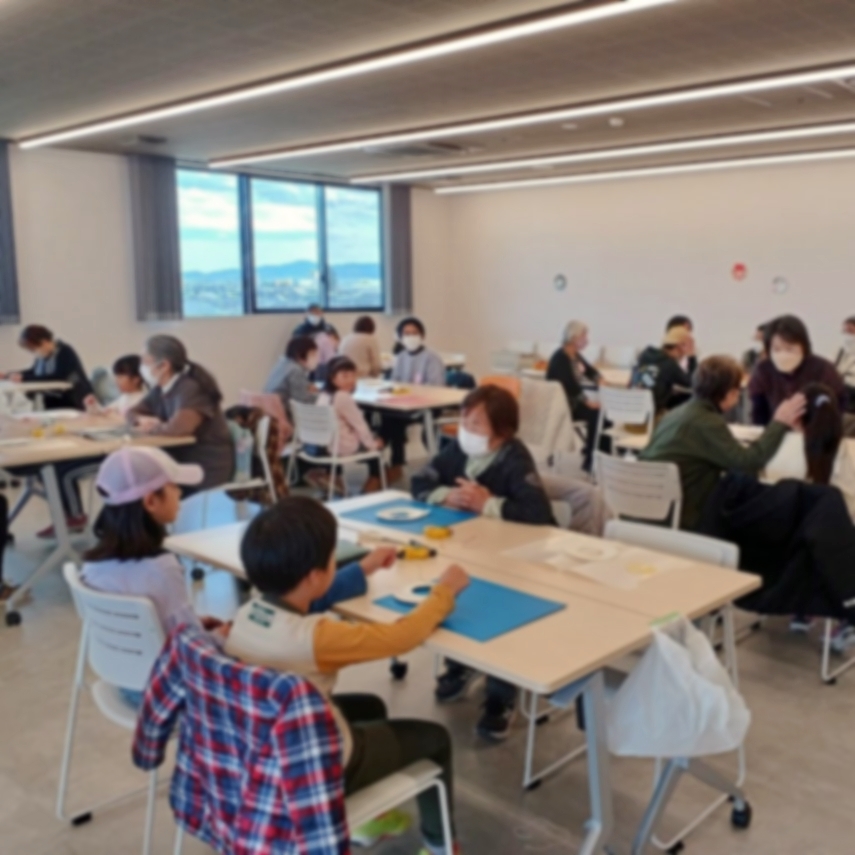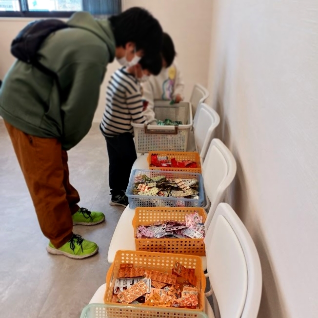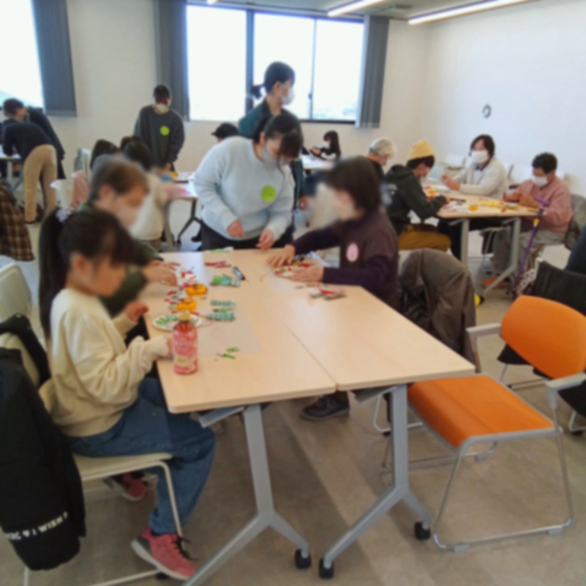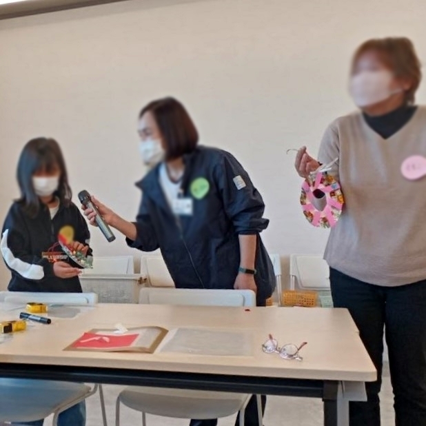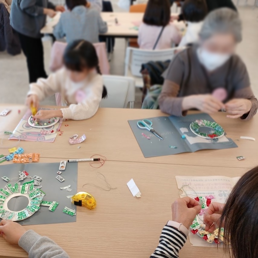 作成したPTPシートのリースにポンポンやリボンで飾り付けをしましたが、用意していた飾りが少なく、足りなくなってしまいました。折り紙が得意な小学生が折り紙で大きなリボンを作って高齢者の方に配ったり、高齢者の方が折り紙を繋げて工夫し、リボン状にしてくださったりして、参加者同士の交流が生まれていました。