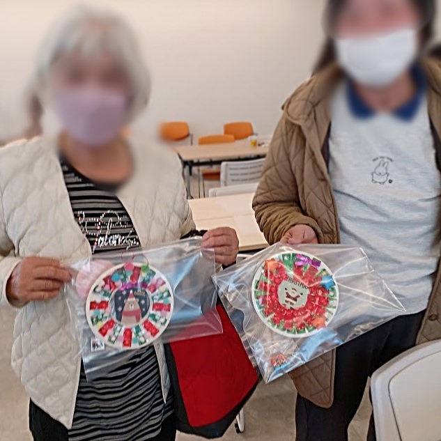クリスマスリースは、真ん中をくり抜いた紙皿にテープのりを付け、PTPシートを貼り付けて作成しました。高齢者の方はテープのりの操作に苦戦する方が多く、お子さんやボランティアさんがお手伝いしていました。