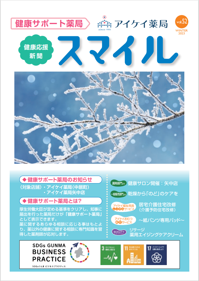 《健康応援新聞》スマイル 2023冬号 vol.52 を配布しております。~主な内容~・健康サロン開催:矢中店・乾燥から「のど」のケアを・居宅介護住宅改修(介護予防住宅改修)・~紙パンツ専用パッド~・【リサージ】薬用エイジングケアクリーム