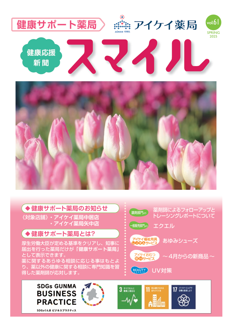 スマイル 2025年 春号vol.61 2025年4月1日 最終更新日時 : 2025年3月31日 アイケイ薬局 《健康応援新聞》スマイル 2025年春号 vol.61を配布しております。【主な内容】・薬剤師によるフォローアップとトレーシングレポートについて・エクエル・あゆみシューズ・おむつ給付~4月からの新商品~・UV対策 スマイル2025 春号vol.61 smile-61ダウンロード
