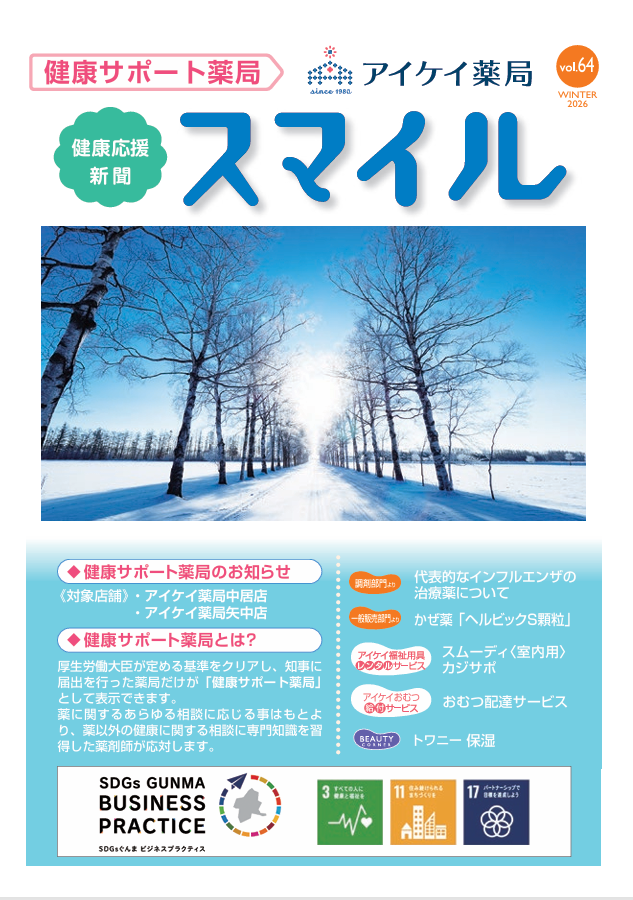 《健康応援新聞》スマイル 2026年冬号 vol.64を配布しております。【主な内容】・代表的なインフルエンザの治療薬について・かぜ薬「ヘルビックS顆粒」・スムーディ〈室内用〉・カジサポ・おむつ配達サービス・トワニー保湿