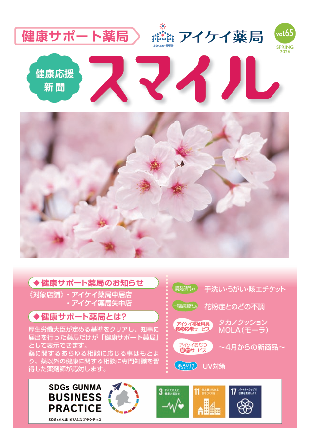 《健康応援新聞》スマイル 2026年春号 vol.65を配布しております。【主な内容】・手洗い・うがい・咳エチケット・花粉症とのどの不調・タカノクッション MORA(モーラ)・大人用おむつ~4月からの新商品~・UV対策