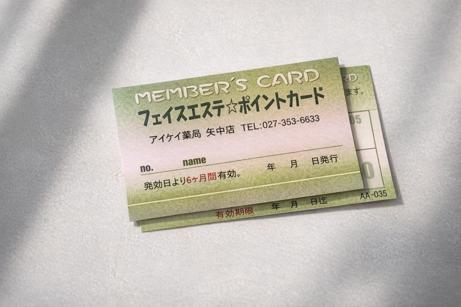 化粧品購入額(税込額)1,000円ごとにエステポイントカードのスタンプを1個押印します。30個たまると無料のフェイスエステ券をプレゼント致します。