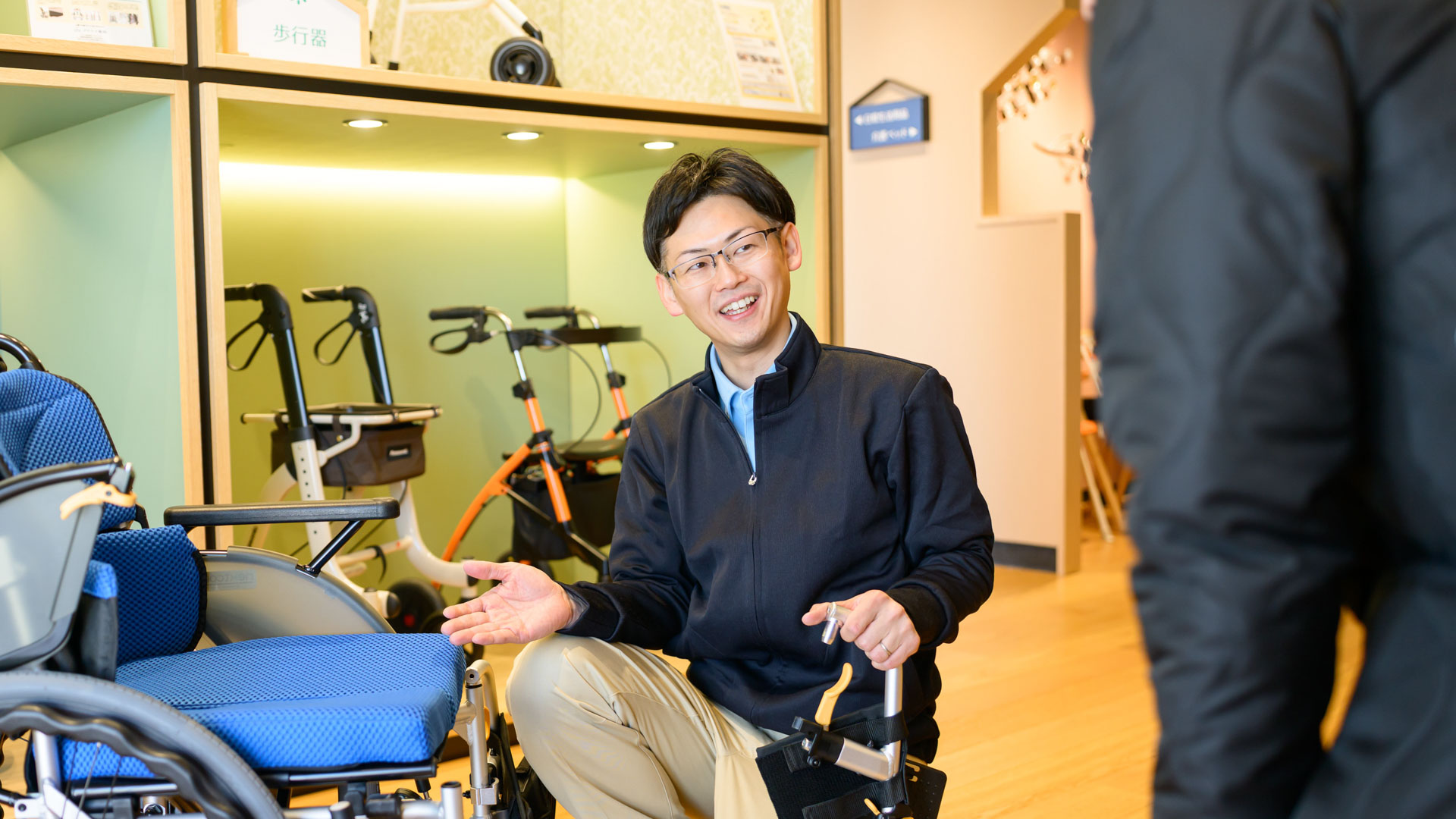 介護保険を利用した福祉用具の提案や納品・販売を主として、住宅改修工事も含め、生活環境を整え、安心した在宅生活が送れるように業務を行っています。「便利になった」「できることが増えた」など、ご提案したもので喜んでいただけたときは、とてもやりがいを感じます。