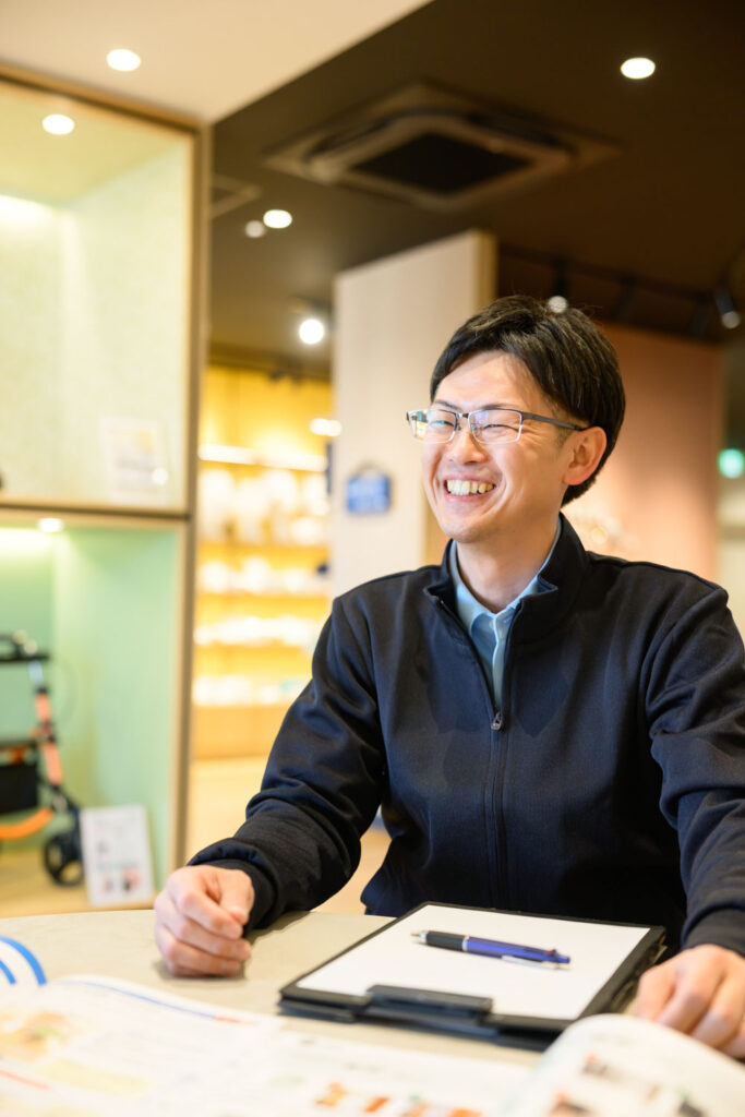 福祉大学を卒業してから全く別の分野で働いていましたが、福祉に関わる仕事をしたいと思っていたところ、福祉用具の販売・レンタルという仕事を知り、応募しました。ノルマ制や飛び込み営業ではなく、取引先のご要望を聞きながら自分のペースで仕事ができることや、体験での雰囲気の良さもあり、入社となりました。